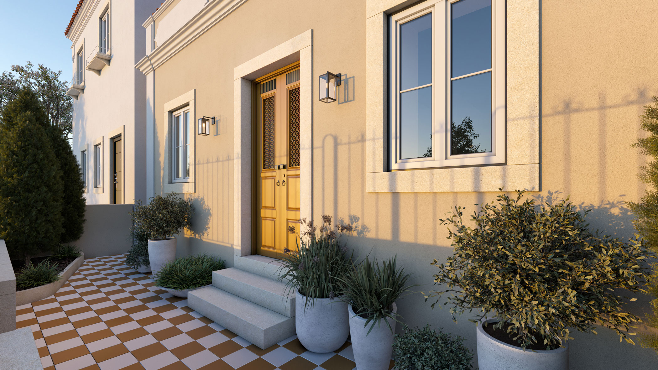 Original carpentry and a front door with period design preserve the home’s historic character. A small garden with vintage paving is located at the entrance, adding to the overall charm.